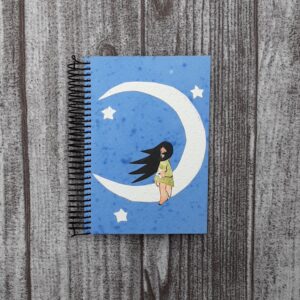 Cuaderno tamaño A5 (15 x 21 cm), de tapa dura y hecha y decorada con papel hecho a mano. Interior de aproximadamente 120 hojas de papel blanco reciclado de 80 gr.