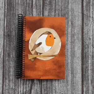 Cuaderno tamaño A5 (15 x 21 cm), de tapa dura y hecha y decorada con papel hecho a mano. Interior de aproximadamente 120 hojas de papel blanco reciclado de 80 gr.