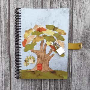 Diario tamaño A6 (11 x 15 cm) , de tapa dura y hecha y decorada con papel hecho a mano. Interior de aproximadamente 100 hojas de papel blanco de 120 gr.